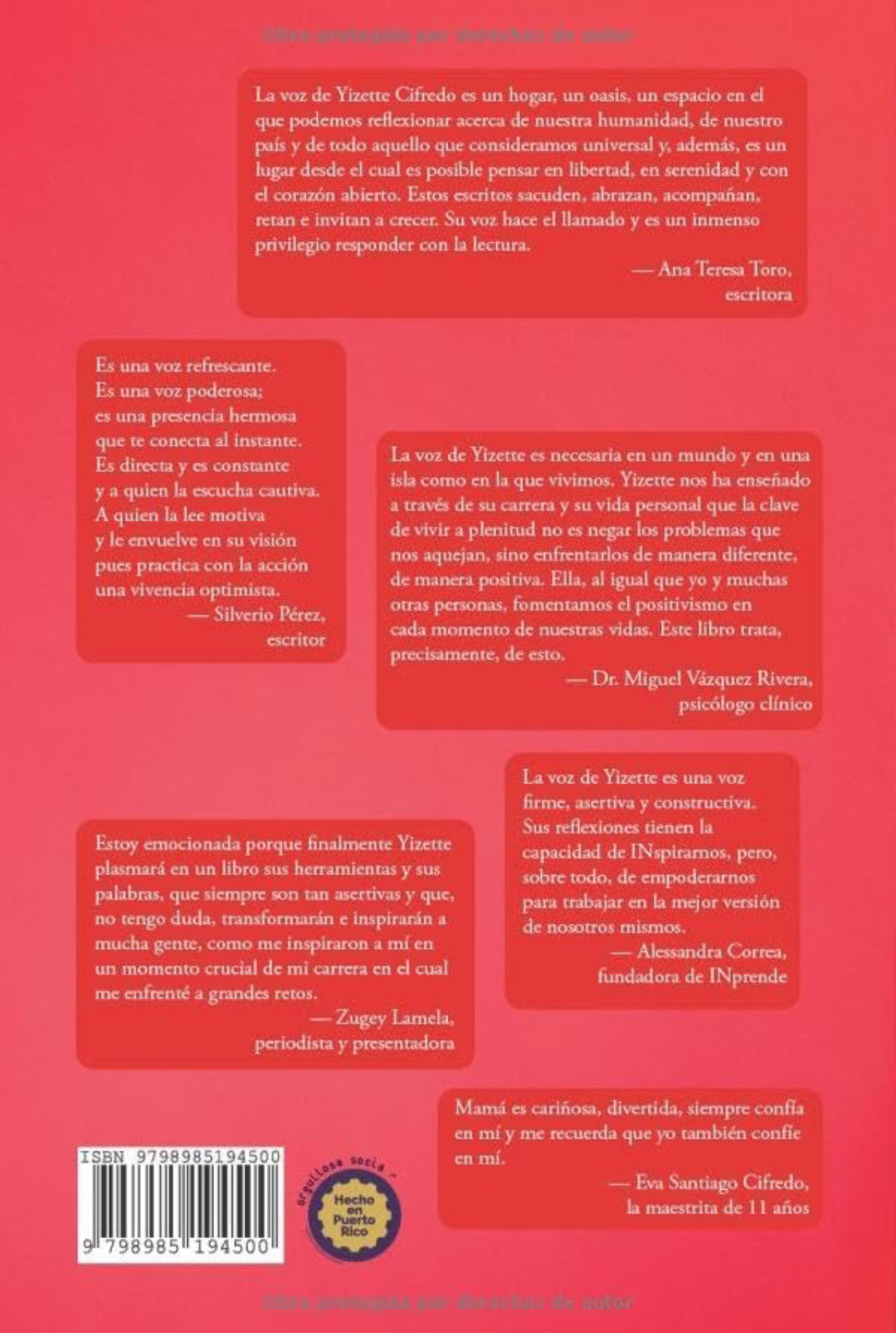 Si alguna vez te ha tocado la fibra una columna de Yizette Cifredo; si en alguna de sus reflexiones pareciera que te hablara directamente y diera consuelo a tu tristeza o calma a tu inquietud, Reflexiones de vida de una optimista compulsiva te ofrece un centenar de oportunidades de revivir esa experiencia y aún más. Con la mirada clara y la palabra dulce pero honesta que caracterizan a la autora, esta compilación de reflexiones te llevará de la mano del optimismo no idealizado por las muy diversas vías que atravesamos en la vida actual.